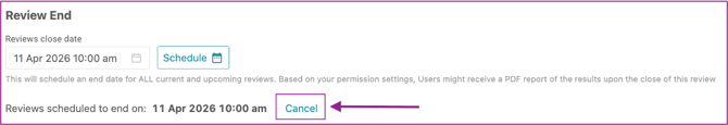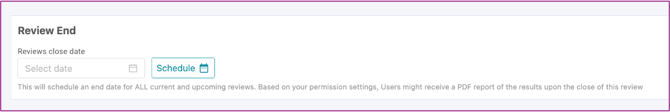 The scheduled close date will apply to all reviewees, it cannot be set for specific individuals. Based on your permission settings, users may receive a PDF report of the results once the review closes