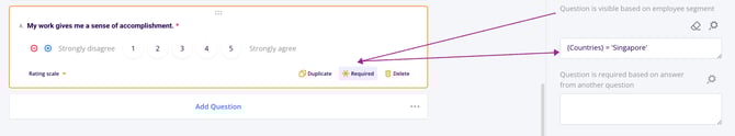 Make Question Required Based on Employee Segment: A question becomes mandatory only for certain employee groups, enabling you to enforce required input for compliance or accountability purposes.