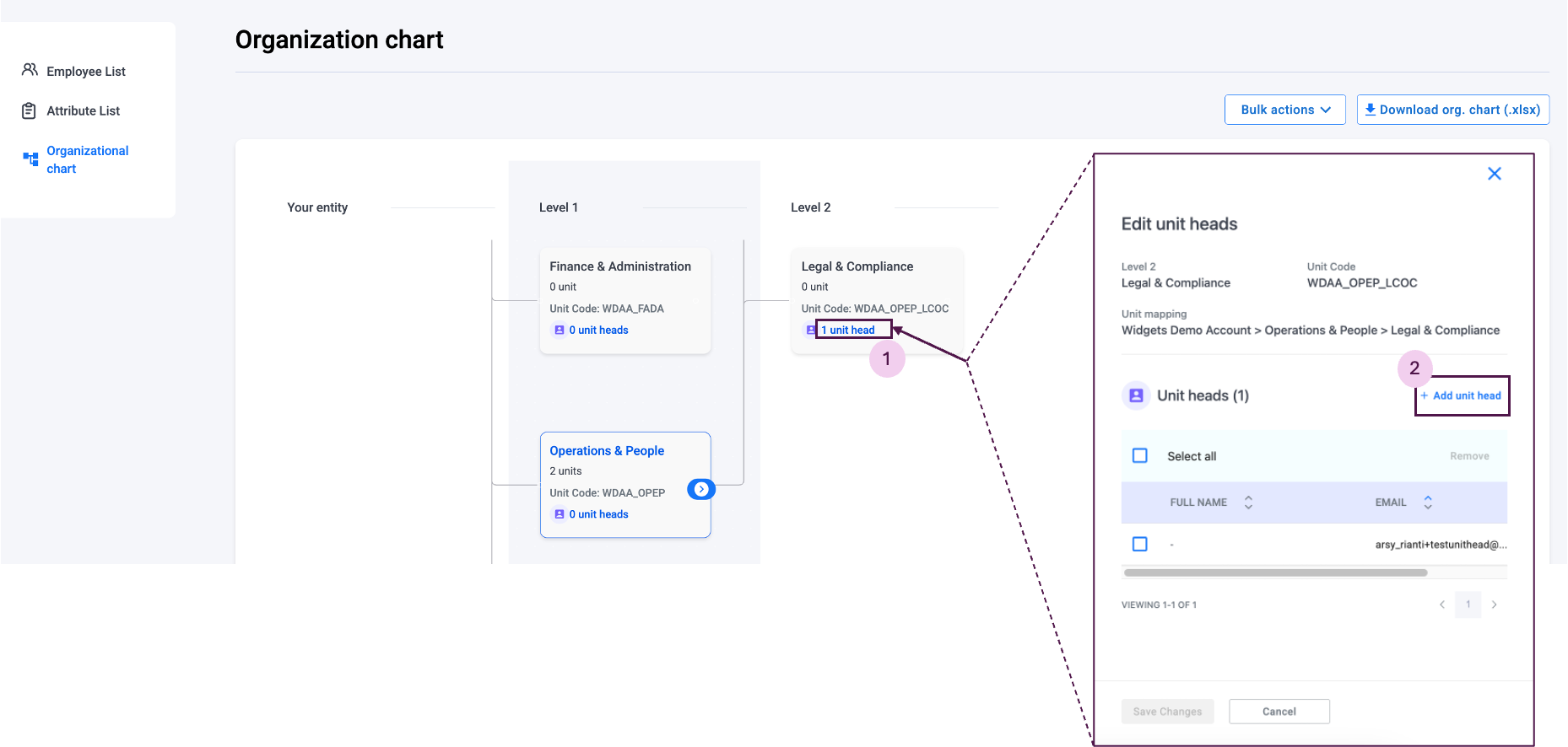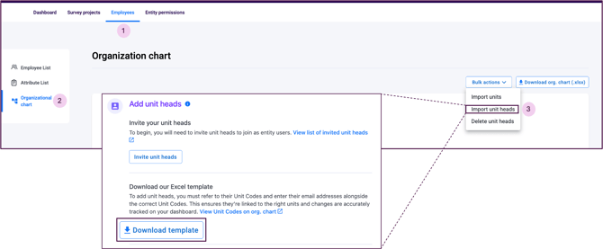 Start by navigating to Employees and opening the Organisational Chart section. Before assigning a Unit Head, ensure the user has already been invited as an entity user. If not, you can invite them via Bulk Actions → Import Unit Heads, similar to above process, then select Invite Unit Heads. You may also refer to the article on inviting individual users from the Permissions page for guidance.