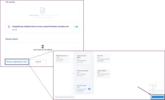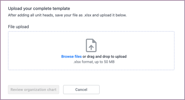After a successful validation, you’ll be shown a summary of the total number of Unit Heads or users that will be assigned. Review the organisational chart carefully, then click Confirm unit heads to complete the process.