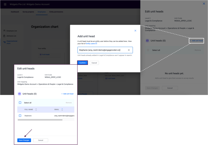 Under that unit, click Unit Heads to open the assignment panel, then select Add Unit Head. Enter the user’s email address in the field provided. As the user is already invited, their name will appear automatically. Click Confirm to finalise the assignment.