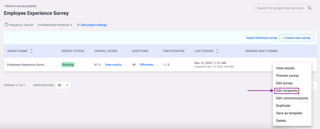 If your survey has already launched and you need to add more recipients, simply navigate to your project page and select the survey name. Click the three dots next to the survey and choose “Edit Recipients.” From there, you can include additional participants, and EngageRocket will automatically send the survey invitations based on your project’s settings.