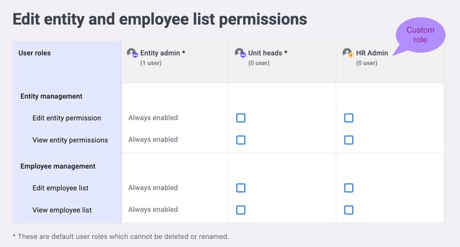 *Note: All functions are always enabled for the Entity Admin role.