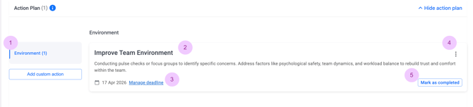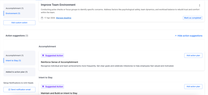 Action Plans are your dedicated workspace for turning employee feedback into concrete commitments. Within ACT, they allow leaders and managers to document, manage, and track follow‑up actions based on survey insights.