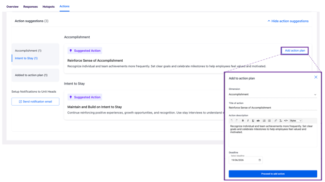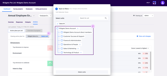 For example, if you create an Action Plan while viewing results for the Sales Department, that action will only appear when the Sales Department filter is selected.